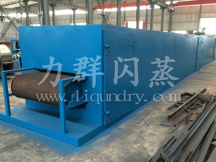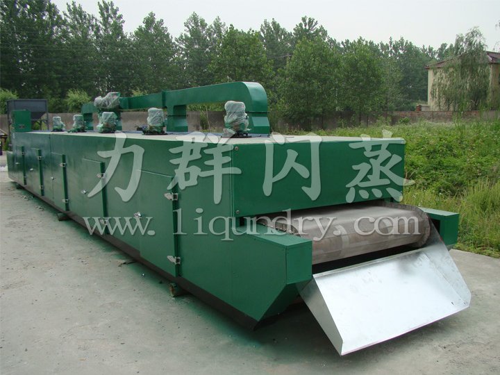 物料由加料器均勻地鋪在網(wǎng)帶上,網(wǎng)帶一般采用12-60目不銹鋼絲網(wǎng),由傳動裝置拖動在干燥機內(nèi)移動。干燥機由若干單元組成,每一單元熱風獨立循環(huán),部分尾氣由專門排濕風機排出,廢氣由調(diào)節(jié)閥控制,熱氣由下往上或由上往下穿過鋪滿物料的網(wǎng)帶完成熱量與質(zhì)量傳遞的進程,帶走物料水份。網(wǎng)帶緩慢移動,運行速度可根據(jù)物料溫度自由調(diào)節(jié),干燥后的成品連續(xù)落入收料器中。上下循環(huán)單元根據(jù)用戶需要可靈活配備,單元數(shù)量亦可根據(jù)需要選取。