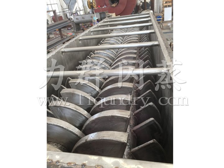 空心軸上密集排列著楔型中空槳葉,熱介質(zhì)經(jīng)空心軸流經(jīng)槳葉。單位有效容積內(nèi)傳熱面積很大,熱介質(zhì)溫度從-40℃到320℃,可以是水蒸汽,也可以是液體型:如熱水、導(dǎo)熱油等。間接傳導(dǎo)加熱,沒(méi)有攜帶空氣帶走熱量,熱量均用來(lái)加熱物料。熱量損失僅為通過(guò)器體保溫層向環(huán)境的散熱。楔型槳葉傳熱面具有自清潔功能。物料顆粒與楔型面的相對(duì)運(yùn)動(dòng)產(chǎn)生洗刷作用,能夠洗刷掉楔型面上附著物料,使運(yùn)轉(zhuǎn)中一直保持著清潔的傳熱面。槳葉干燥機(jī)的殼體為Ω型,殼體內(nèi)一般安排二到四根空心攪拌軸。殼體有密封端蓋與上蓋,防止物料粉塵外泄而充分發(fā)揮作用。