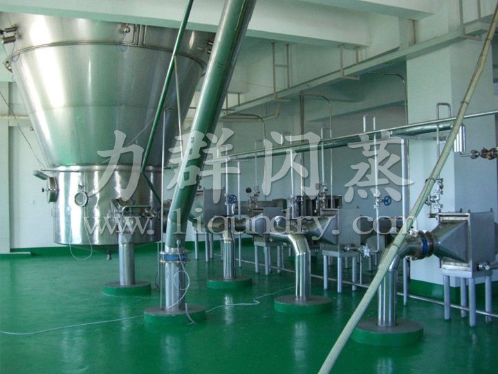 該生產(chǎn)線由供料系統(tǒng)、介質(zhì)循環(huán)系統(tǒng)、空氣加熱凈化系統(tǒng)、干燥塔系統(tǒng)、收料系統(tǒng)、控制系統(tǒng)等多個(gè)系統(tǒng)整合而成。主塔系統(tǒng)集中了目前噴霧干燥工程的所有尖端技術(shù),噴干機(jī)組的收料系統(tǒng)由一級(jí)旋風(fēng)分離器+布袋除塵器組合形成。一級(jí)旋風(fēng)采用高氣量高效率旋風(fēng)進(jìn)行收集,其收粉率能達(dá)到96%左右分,而布袋除塵器是針對(duì)蛋白粉類(lèi)除塵專(zhuān)門(mén)設(shè)計(jì)的優(yōu)化設(shè)備,能使物料與風(fēng)進(jìn)行完全分離并沉降,布袋為拒水防油防靜電布袋,過(guò)濾目數(shù)可達(dá)500目以上。
